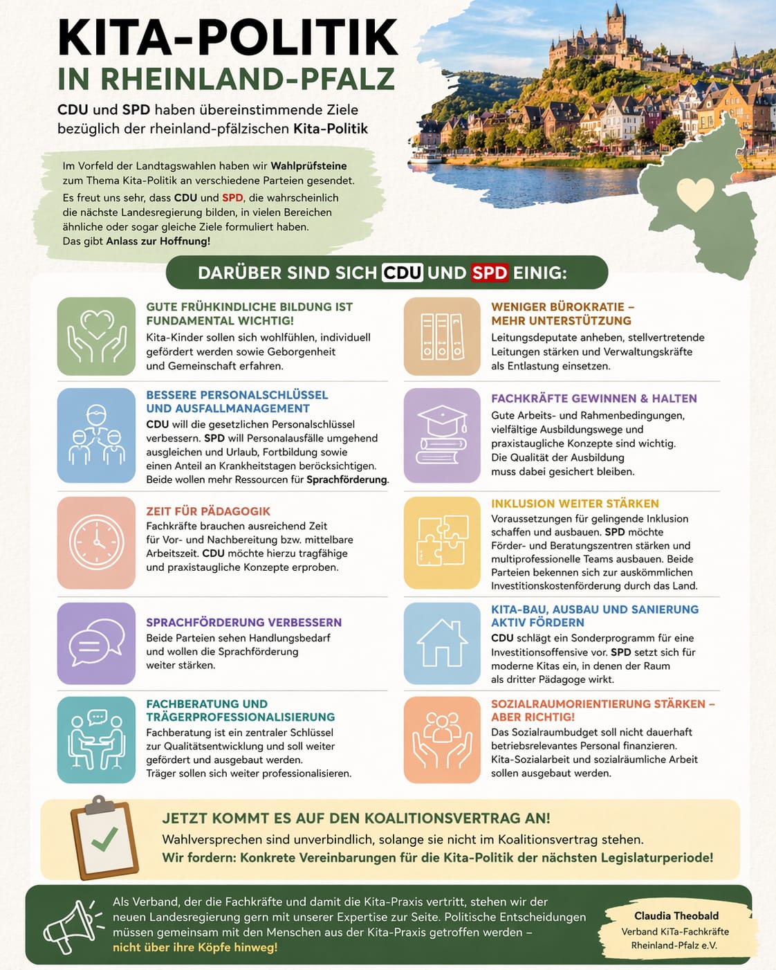 Kinder, Fachkräfte und Eltern leben tagtäglich mit den Entscheidungen, welche für den Kita-Bereich politisch getroffen werden. Als Stimme aus der Praxis steht der Kita-Fachkräfteverband RLP der neuen Landesregierung gern zur Verfügung. Wir hoffen, dass unsere Ressourcen und Perspektiven, die wir im Rahmen der Verantwortungsgemeinschaft des Kita-Systems mit einbringen können, genutzt werden.